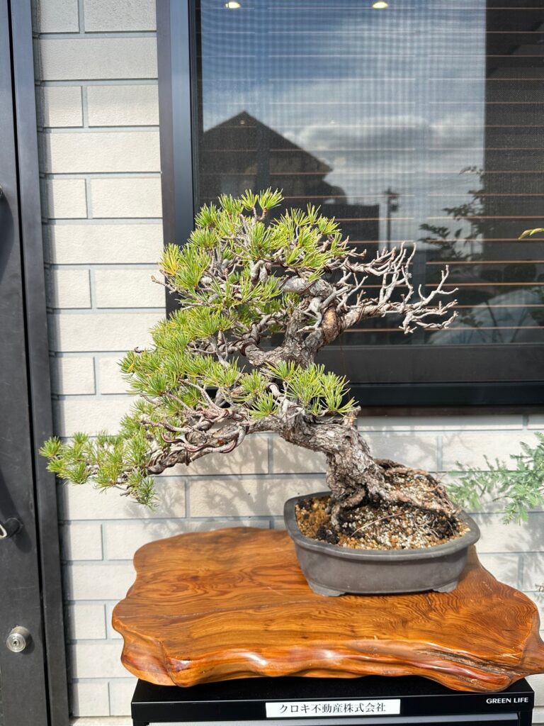 今まではコンパクトな盆栽を事務所内の棚に置いていましたが、外に置くと通行人の方が盆栽を見てくださるのを見かけるので嬉しくなります。
